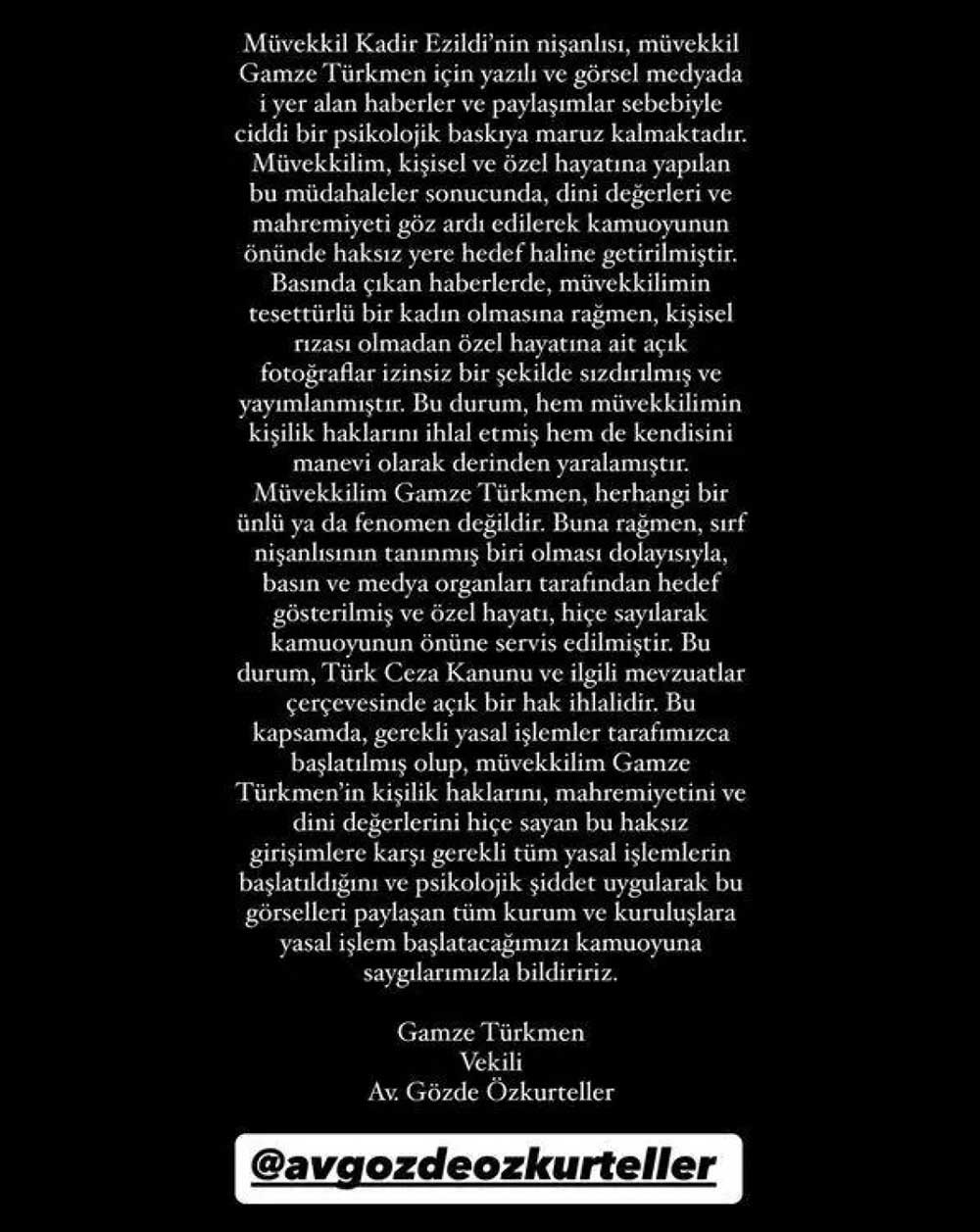 Gamze Türkmen’in özel görüntülerinin bir magazin programında yayınlanması büyük tepkiye neden oldu. Kadir Ezildi, nişanlısı Türkmen’in açık saç ve altınlarla süslenmiş pozlarının yayımlanmasından rahatsızlık duydu. Türkmen, güzel sanatlar fakültesi mezunu ve tanınmış ses sanatçısı Fırat Türkmen’in kardeşi olup özel hayatını gizli tutmayı tercih ediyor.
